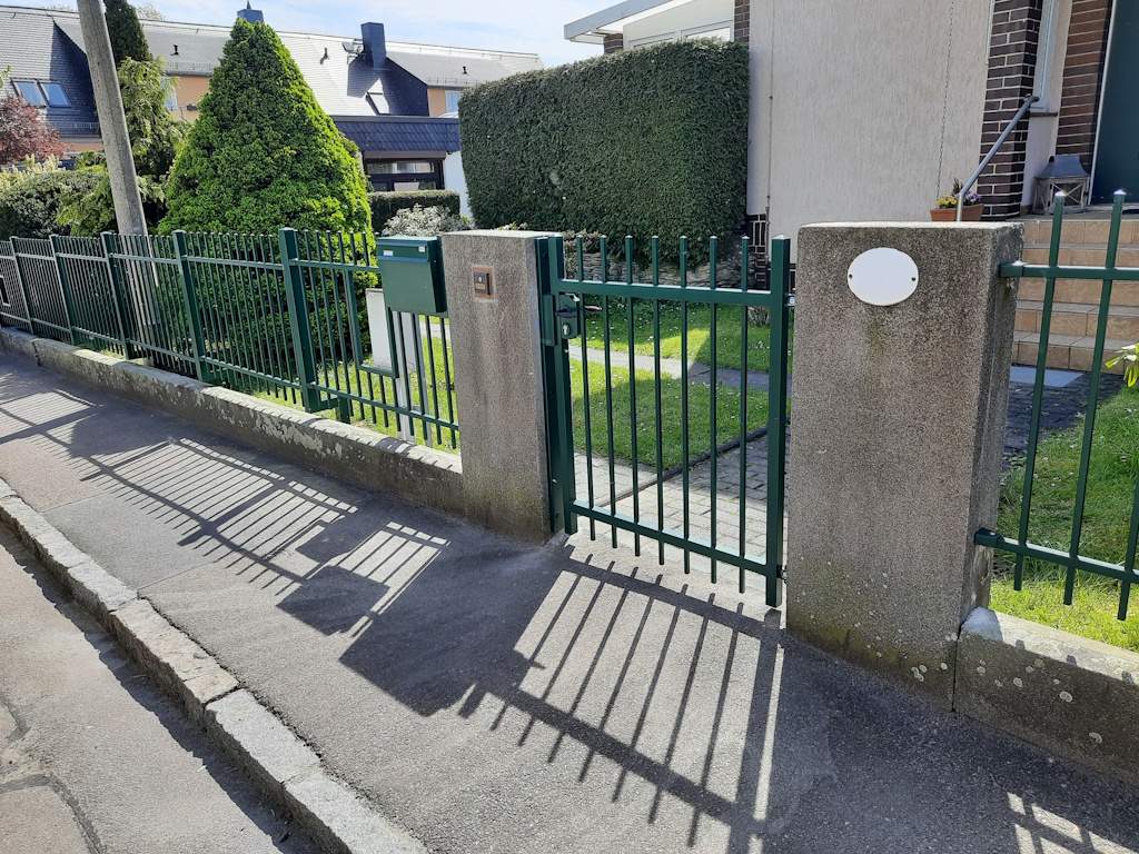 - passende Pfosten mit Fußplatte zum Aufschrauben bzw. Montageleisten / Scharniere zur Befestigung an Betonpfosten / Mauersäulen gern auf Anfrage