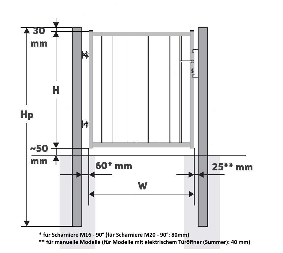 - Breite inkl. Pfosten: 124,5 cm / 126 cm für Modelle mit elektrischem Türöffner