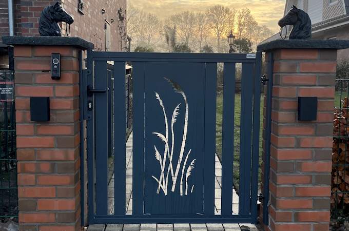 Bei dem Doppelflügeltor „Rubin 1“ mit TOP-Antrieb ist die LED-Warnleuchte und die Steuerung im Torpfosten integriert. Weiterhin sind im TOP-Paket bereits eine Umgebungsbeleuchtung und eine Lichtschranke enthalten. Die Steuerung des Zweiflügeltors und der LED-Beleuchtung über das Smartphone ist gegen Aufpreis möglich.
